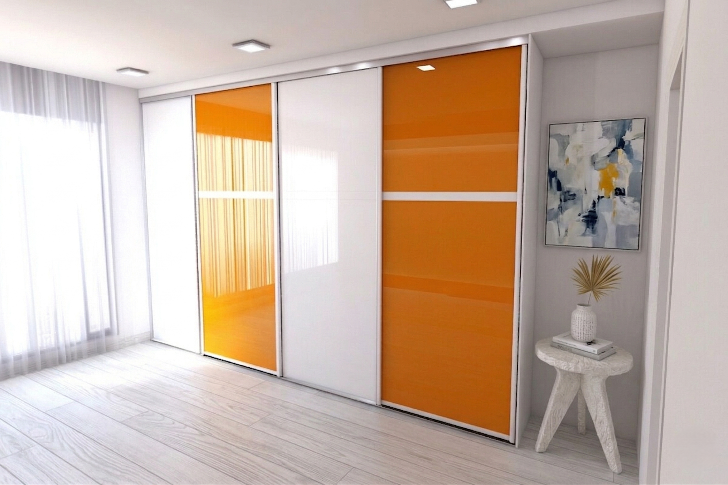 Personalizare: Decorul adaugat in partea dreapta – masuta cu trei picioare si tabloul abstract – demonstreaza cum acest dressing poate fi baza unei amenajari armonioase. Culorile mobilierului, respectiv a usilor glisante se regasesc in piesele de arta si decorul camerei.