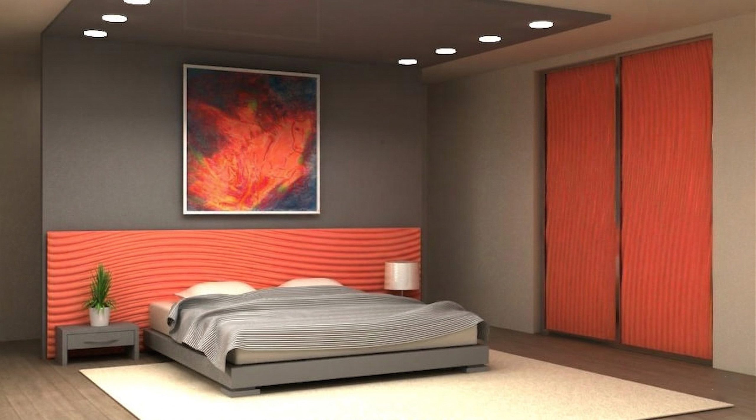 Amenajarea propusa mizeaza pe un contrast indraznet intre tonurile de gri antracit si galben solar. Fundalul minimalist scoate in evidenta textura ondulata a panoului decorativ care serveste drept tablie de pat. Lumina este un element cheie, plafonul fiind echipat cu spoturi integrate ce creeaza o atmosfera calda. Aceasta abordare scandinava cu influente moderne transforma dormitorul intr-un sanctuar al relaxarii absolute.