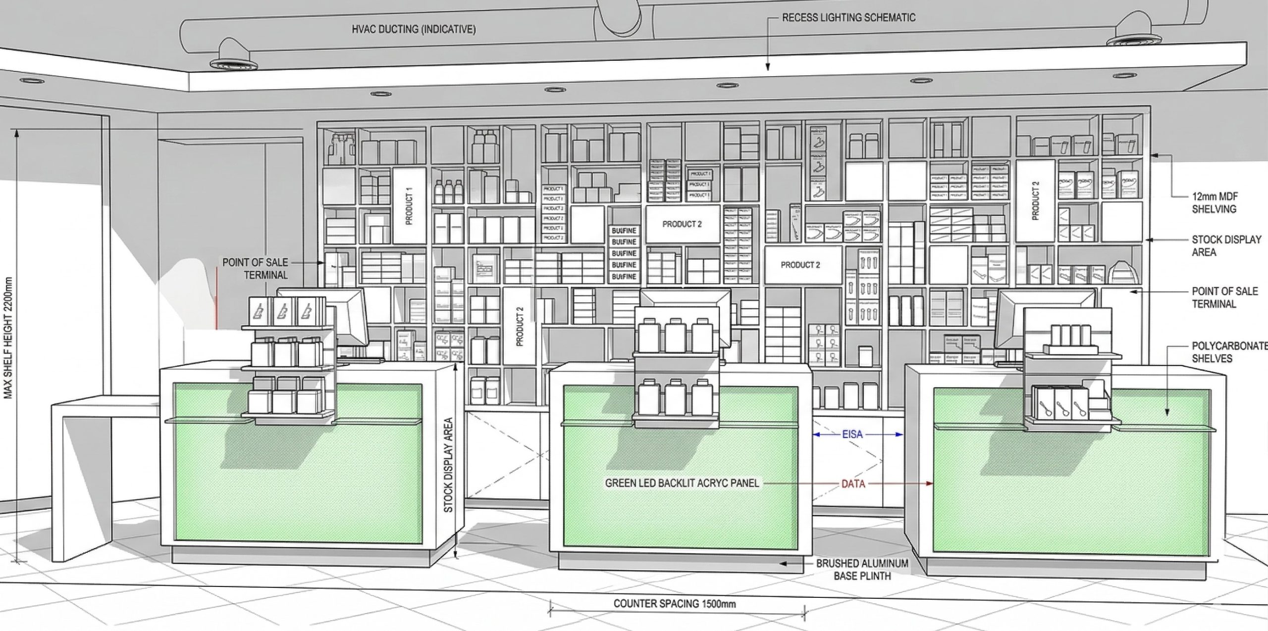 Materialele folosite au suprafete netede, fiind usor de curatat si de intretinut conform normelor sanitare. Lumina ambientala este puternica si uniforma, punand in valoare culorile vii ale mobilierului ales. Pardoseala gri inchis ofera o baza solida si sobra pentru elementele albe si verzi. Acest design transforma experienta de cumparare intr-una placuta si extrem de eficienta. Intregul ansamblu reflecta o identitate de brand puternica si un mediu de lucru bine optimizat. Mobilierul imbina perfect latura estetica cu rigoarea necesara intr-un spatiu medical.